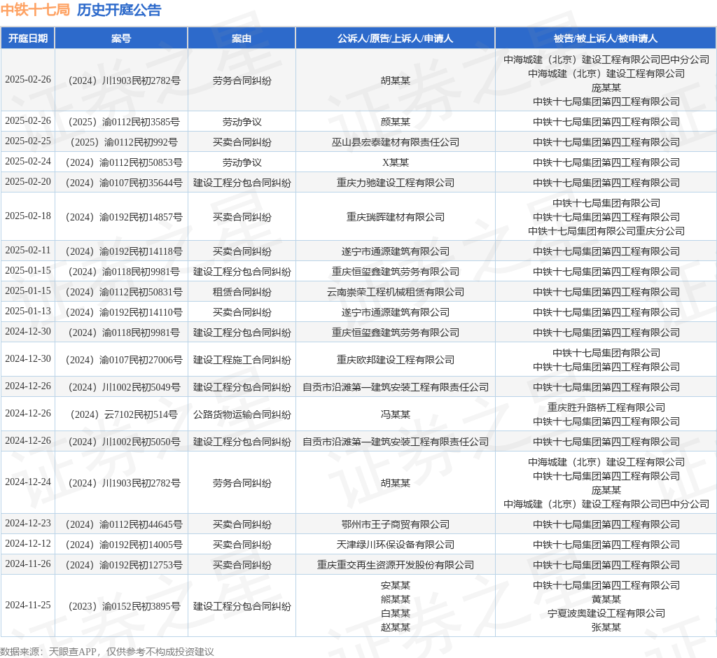 本站消息,根据天眼查APP显示,近日公布了一则中铁十七局集团第四工程有限公司作为被告/被上诉人的开庭公告,详细内容如下: